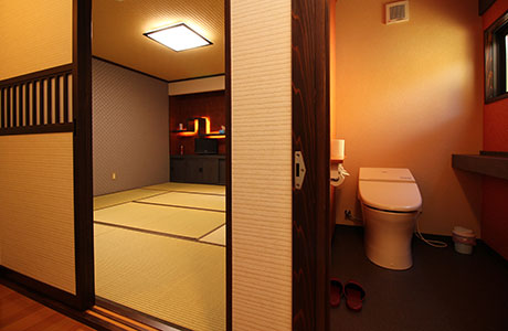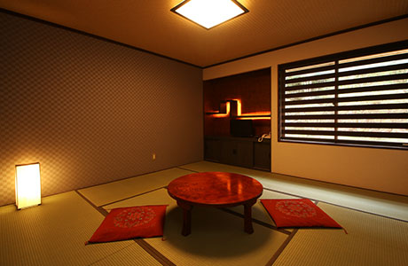 2018年4月新設した和モダンルーム。 丸テーブルと間接照明、トイレ・洗面所付きのお部屋です。